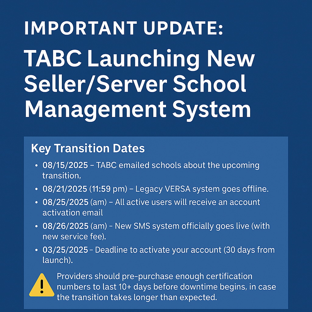 The Texas Alcoholic Beverage Commission (TABC) is retiring its legacy VERSA system and launching the new Seller/Server School Management System (SMS). This transition will affect every approved seller/server training provider in Texas. The new platform is designed to centralize and simplify applications, renewals, fees, certification numbers, and compliance reporting — all in one place. Key […]