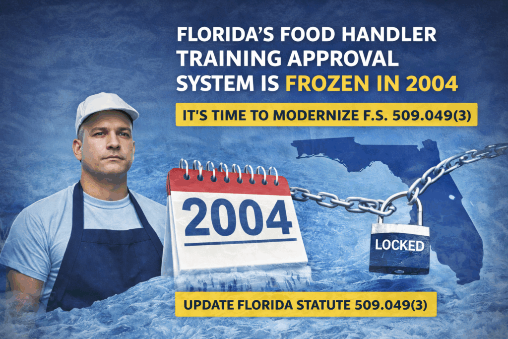 Florida’s Food Handler Training Approval System Is Frozen in 2004 — It’s Time to Modernize F.S. 509.049(3) Florida’s hospitality industry is one of the largest in the nation. Thousands of restaurants, bars, hotels, and food service operations rely on trained employees to protect public health and operate safely every day. But Florida’s current Food Service […]