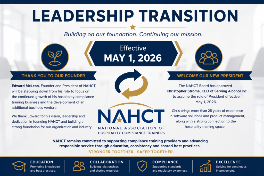 The National Association of Hospitality Compliance Trainers (NAHCT) announces a leadership transition effective May 1, 2026. Edward McLean, Founder and President of NAHCT, will be stepping down from his role to focus on the continued growth of his hospitality compliance training business and the development of an additional business venture. Since founding NAHCT, Edward has […]
